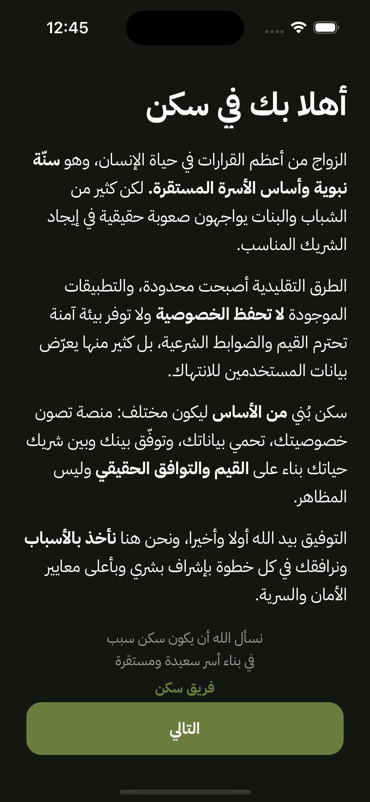 سكن ليس تطبيق تعارف تقليدي — صُمم ليكون مختلفاً من الأساس. خصوصيتك محفوظة بالكامل، التوافق مبني على القيم والأولويات وليس الصور والمظاهر، رحلتك بإشراف فريق بشري وليس خوارزمية باردة، والمسار شرعي ومنظّم من التعارف إلى الخطبة.